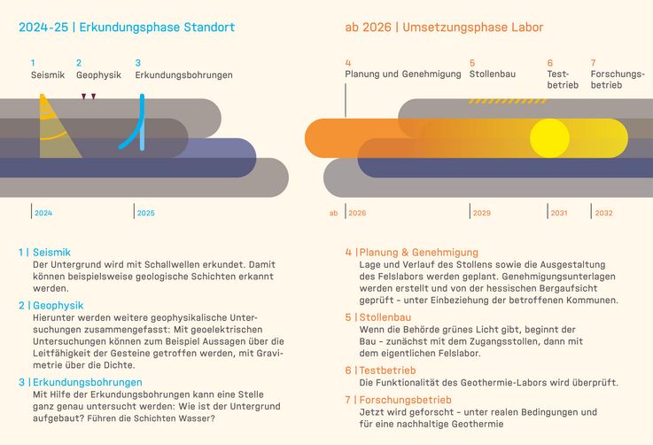 Das Projekt GeoLaB gliedert sich in mehrere Projektphasen: Aktuell läuft die Erkundungsphase, auch Aufsuchungsphase genannt, daran schließt sich später die Planungs- und Errichtungsphase an. Erst danach beginnt der eigentliche Forschungsbetrieb.